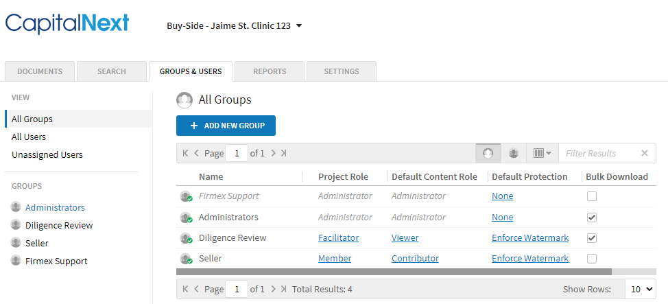 Each project contains similar groups with similar permissions. Namely, each project contains the target group – the seller, as well one or two internal groups – one group to Administer the project, and the other to review diligence.