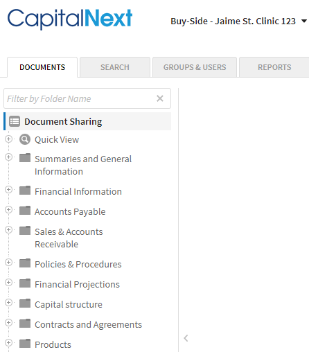 Each project contains a request list, which is an empty group of folders the counterparty will be uploading documents to. You would pre-populate each project with different empty folder structures depending on the seller’s industry. For example, this corporate healthcare company has project and folder templates for both single and multiple practitioner clinics. This way, there’s no need to upload a folder structure each time you start a new project.