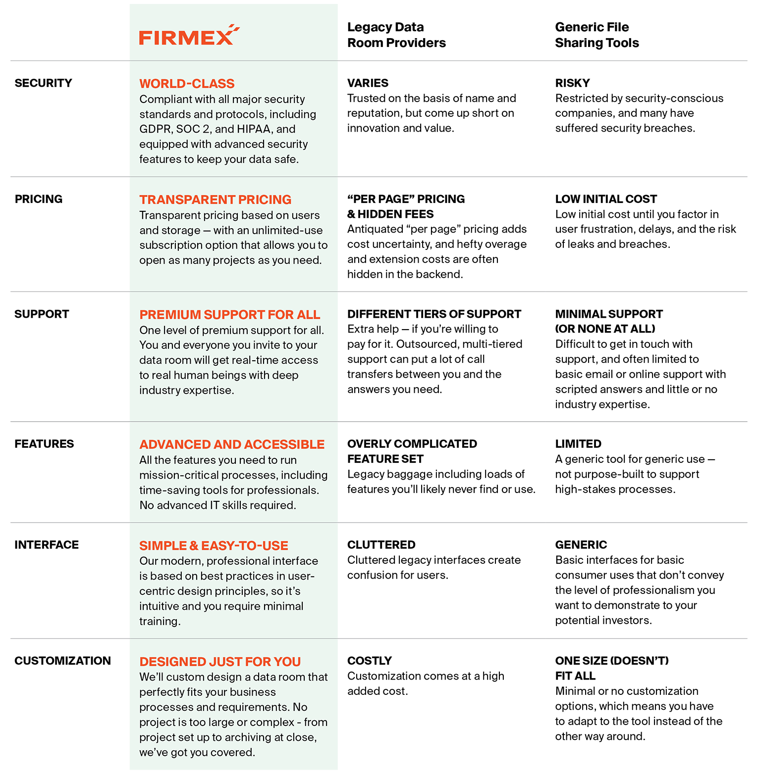 Easy to use, affordable, and backed by 24/7 support, you can trust Firmex Virtual Data Rooms to run mission-critical processes and get projects finished faster. Over 120,000 companies have used Firmex to share confidential documents during mergers and acquisitions, fundraising, audits, litigation, and procurement projects with billions of dollars at stake. Firmex can have your project live within minutes, and every user has access to the same expert support as you do. No hidden fees or unexpected overages. Get started with Firmex today.