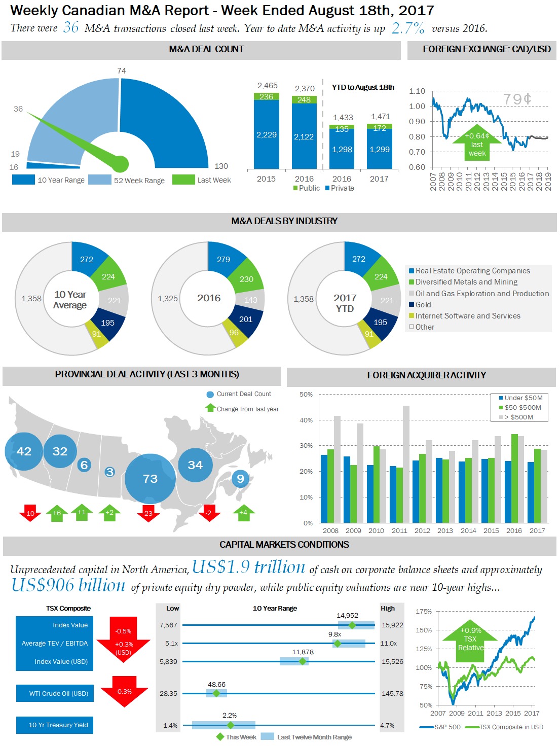 This infographic from Valitas Capital Partners provides a snapshot view of M&A activity in the Canadian market for the week ended August 18, 2017.
