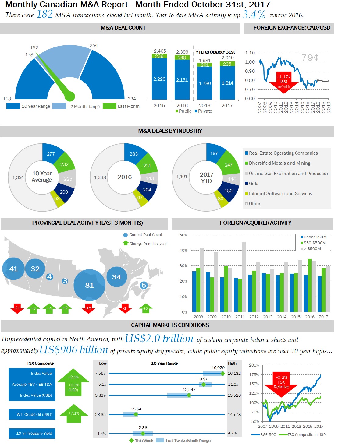 One hundred and eighty-two Canadian M&A transactions closed in October. Year to date, M&A closed deal count is 3.4% higher than the comparable period in 2016. The Canadian dollar depreciated relative to the U.S. dollar by 1.17 cents, ending the month at 79 cents. WTI Crude oil prices rose by 7.1% in October, ending the month at $55.64 per barrel.