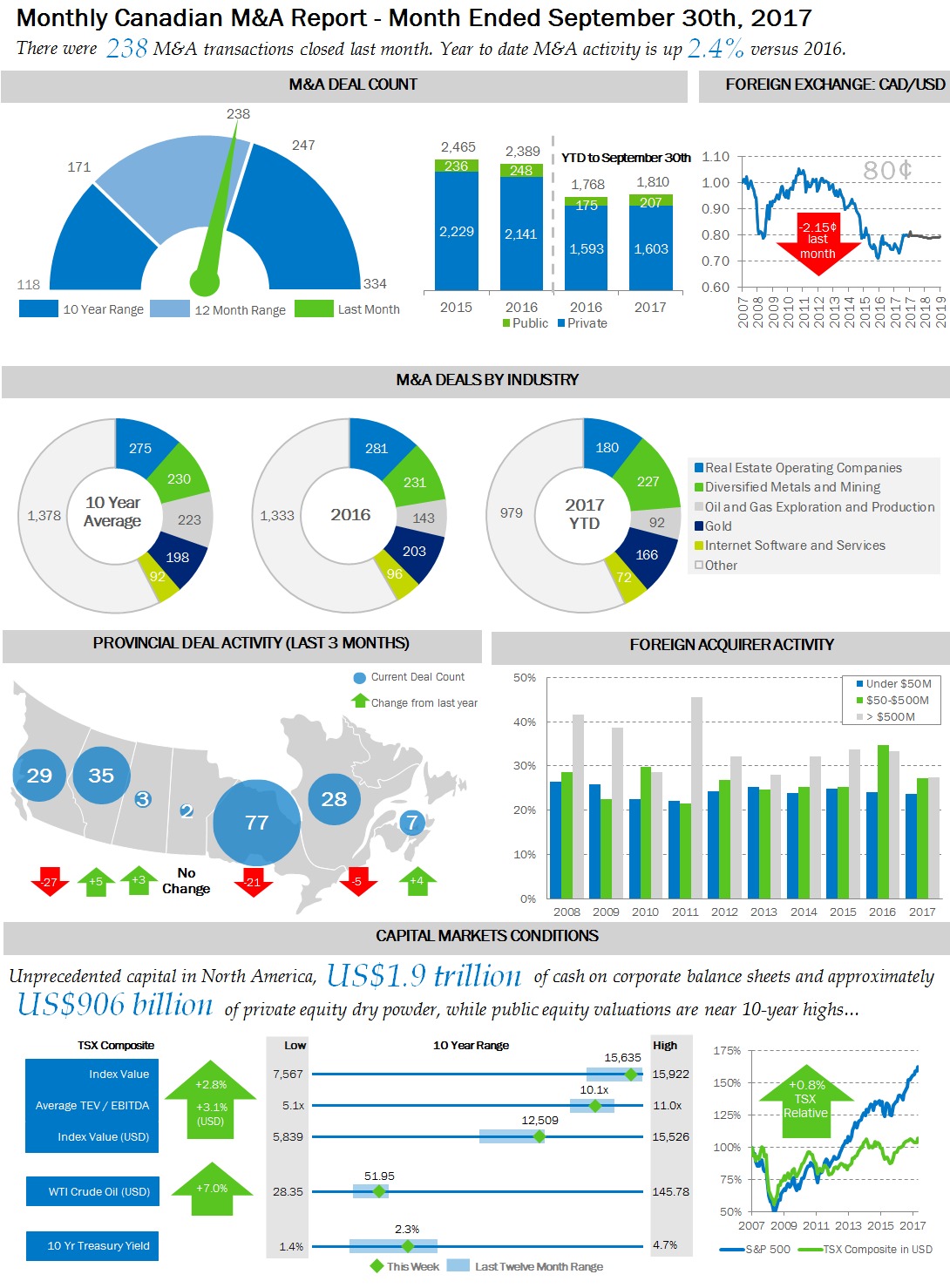 Two hundred and thirty-eight Canadian M&A transactions closed in September. Year to date, M&A closed deal count is 2.4% higher than the comparable period in 2016. The Canadian dollar depreciated relative to the U.S. dollar by 2.15 cents, ending the month at 80 cents. WTI Crude oil prices rose by 7.0% in September, ending the month at $51.95 per barrel.
